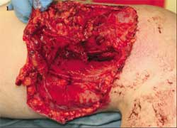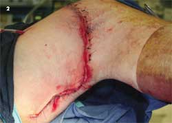 A 16-year-old was riding a 4-wheel adult-sized ATV without a helmet. When jumping his ATV, the vehicle hit hard coming down; he was propelled over the handle bars and the ATV landed on top of him. He sustained a full-thickness, large (22.5 cm) left distal medial thigh soft tissue injury. The exact mechanism was unknown. The saphenous vein, which was not injured, can be seen in Figure 1. There were no other significant injuries or fractures.