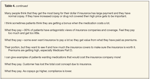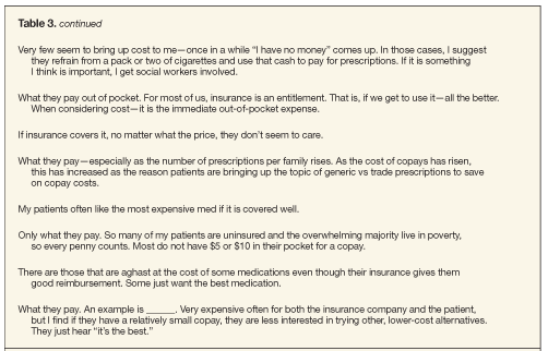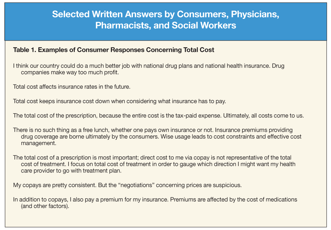None of the demographic variables we collected for consumers (age; sex; education; experiencing financial hardship resulting from prescription drug costs; or hours spent watching television, listening to radio, or reading newspapers/magazines) were useful for discriminating between those who reported “total cost” compared with other response options. However, written responses provided insight into why respondents reported total cost as being most important to them (Table 1 in “Selected Written Answers by Consumers, Physicians, Pharmacists, and Social Workers”).