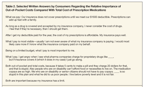 We suggest that multiple segments of the health care consumer market focus on different types of cost information when making de- cisions about prescription drug therapy. Although increasing insur- ance coverage for prescription drugs can improve individuals’ access to medications, out-of-pocket expens- es in addition to premiums can be burdensome to certain groups of consumers.
