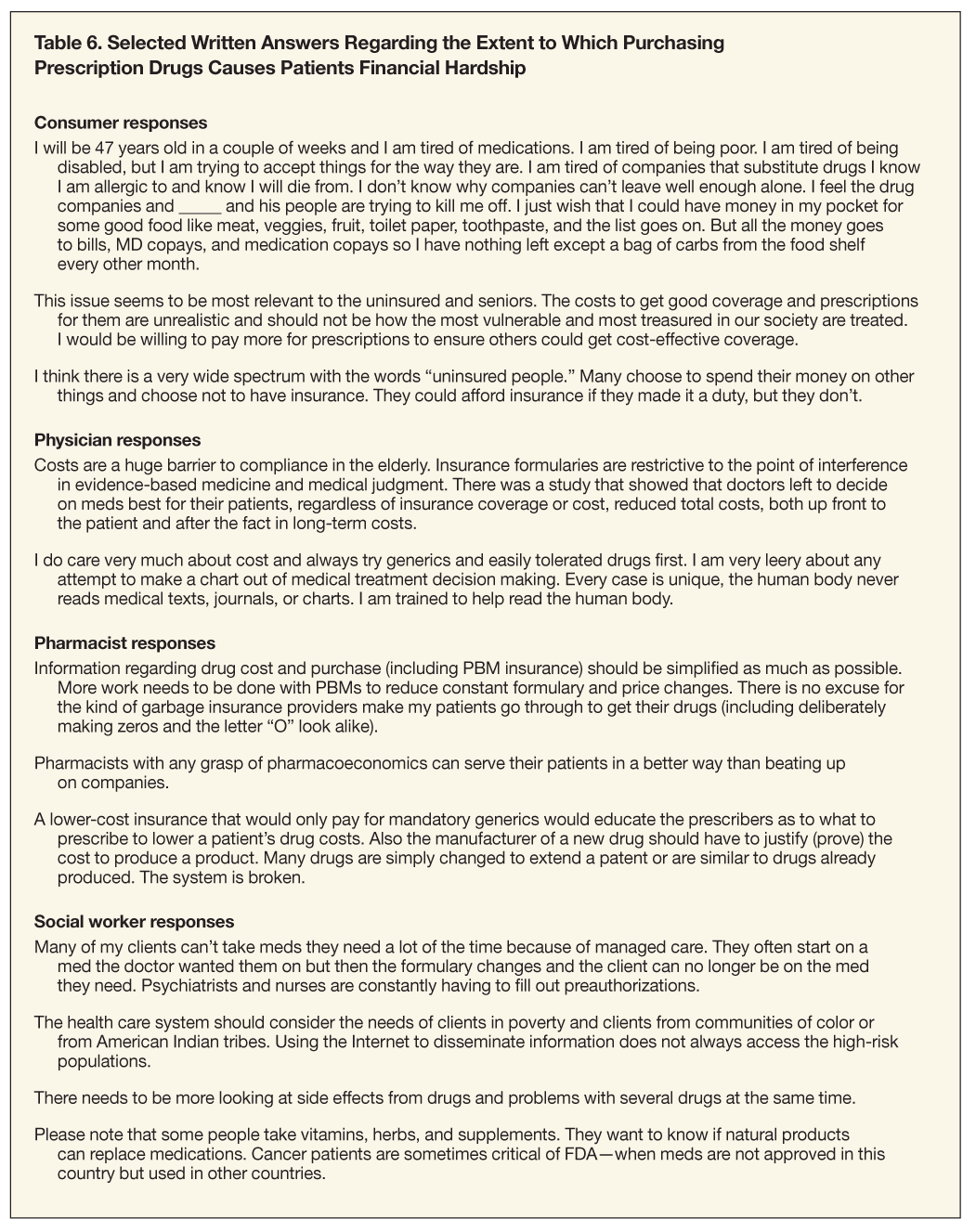To provide further insight into these findings, verbatim written responses are provided in Table 6 in “Selected Written Answers by Consumers, Physicians, Pharmacists, and Social Workers.”