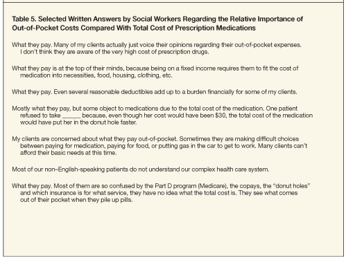 At the time of our study, access to prescription drugs had been improved through broader prescription drug insurance coverage. However, some prescription drugs still could be prohibitively expensive for certain patients, even if they had insurance coverage for them. Navigating patients’ prescription drug options in light of related costs can be difficult because of a lack of information on the parts of both prescribers and their patients.13 For example, Shrank and colleagues14 reported that many prescribers of medications are not aware of patients’ formularies or out-of-pocket costs for medications, do not feel responsible for managing these costs, and prefer that a pharmacist address these matters.