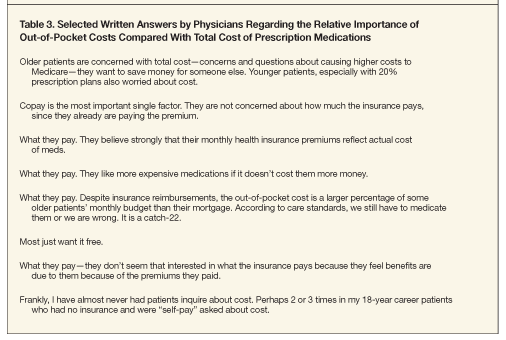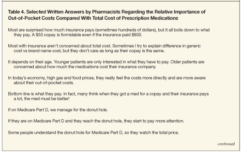 Such a description of the prescription choice process from several viewpoints would provide insight for developing strategies for incorporating not only effectiveness and safety information but also cost information into medication-use decisions. Preliminary findings regarding these areas of focus have been presented elsewhere.19-23 The purpose of this article is to present findings related to the relative importance of out-of-pocket costs compared with total cost of prescription medications within the context of decision making about prescription drugs.