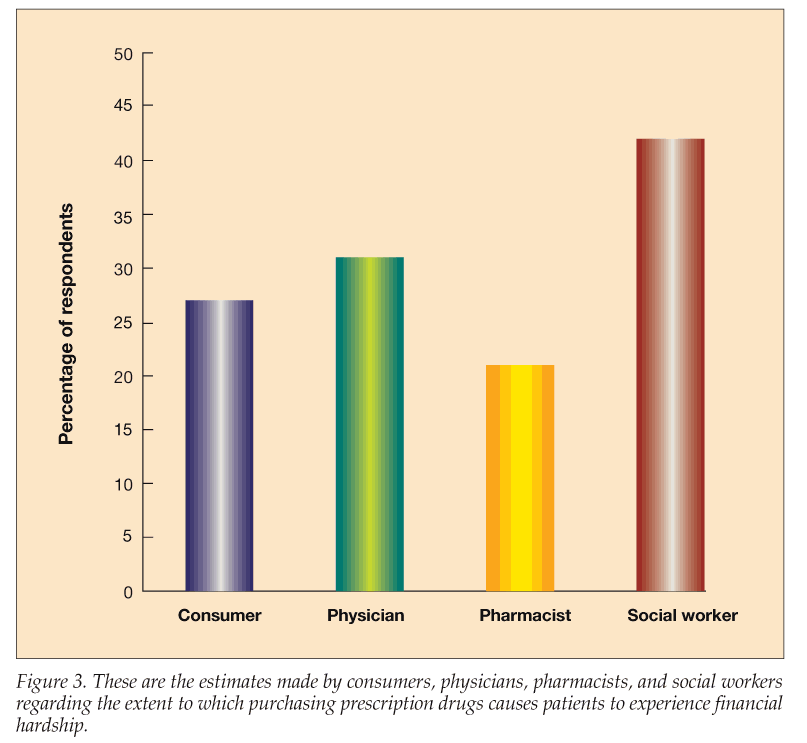 Figure 3 also shows that physicians’ estimates of financial hardship for patients (31% of their patients) were similar to what consumers reported. The estimate of 21% made by pharmacists was lower but not statistically different. The relative- ly higher estimate of 42% made by social workers (P = .05, statistically significant) probably reflects their client base.