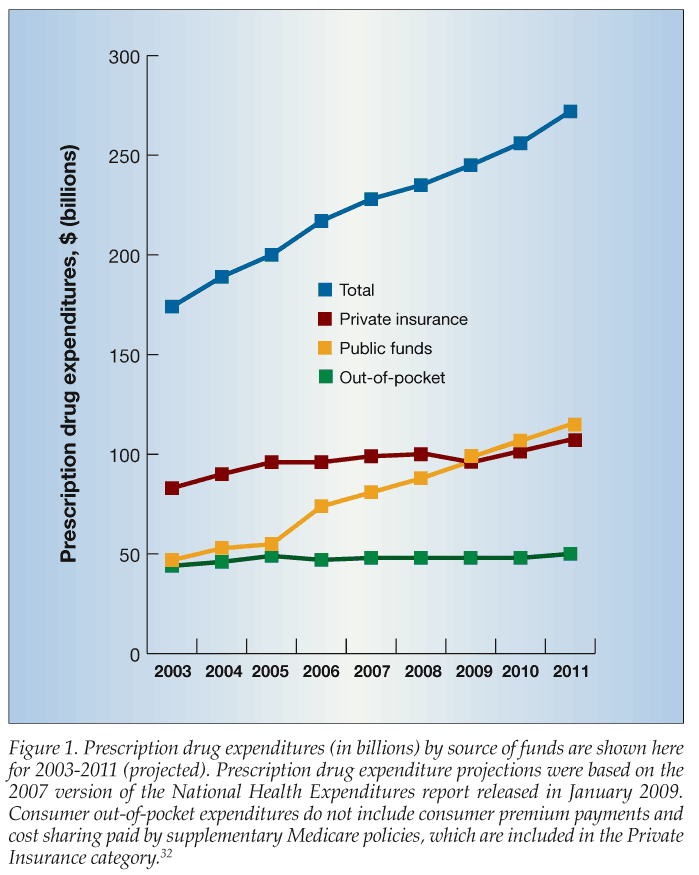Although prescription drug spending has been a smaller proportion of total national health care spending (10% in 2006) compared with hospital services (31%) and physician services (21%),4 it was one of the fastest-growing health expenditures between 1997 and 2002. To help improve access to prescription medications, the share of prescription drug expenses paid by third parties, such as private health insurance and public funds, continued to grow between 2003 and 2008, leaving a smaller proportion to be paid out-of-pocket by consumers (out-of-pocket payments were 26% of total expenditures in 2003 compared with 20% in 2008). Figure 1 summarizes prescription drug expenditures by source of funds for 2003 to 2011 (projected). It should be noted that 2006 was the year Medicare Part D coverage for prescription medications took effect.