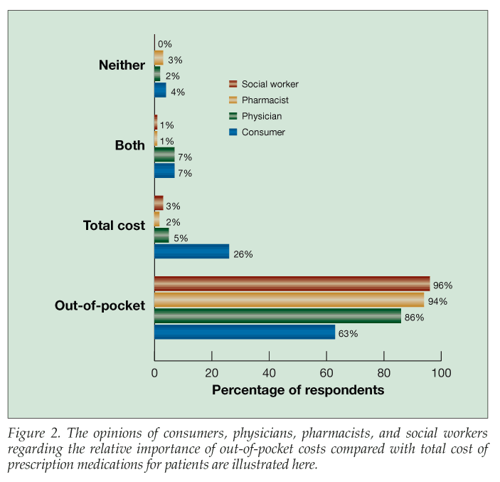 The first objective is to describe and compare the opinions of consumers, physicians, pharmacists, and social workers concerning the relative importance of out-of-pocket costs compared with total cost of prescription medications for patients. The second objective is to compare estimates made by consumers, physicians, pharmacists, and social workers regarding the extent to which purchasing prescription drugs causes patients to experience financial hardship.