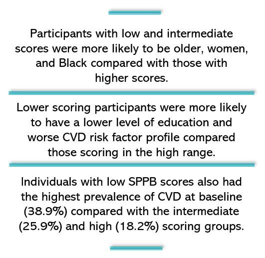 Moreover, the authors report that compared with adults with high SPPB scores, those with low scores were approximately 46% more likely to experience at least 1 CVD event.