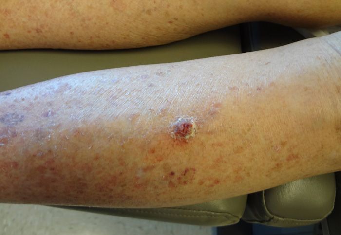 An 88-year-old woman sought medical attention for a nodule on the anterior surface of her left foreleg that had gradually developed.