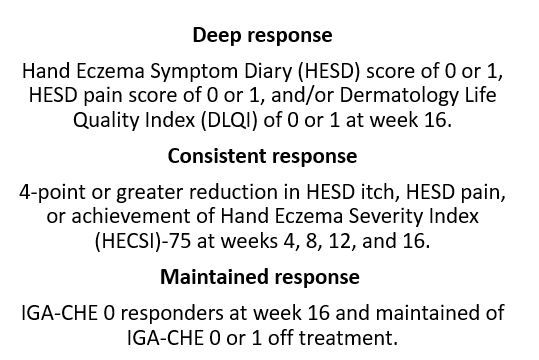 The post hoc subgroup analysis was based on the treatment response to delgocitinib cream used for 16 weeks in a group of participants with either a deep, consistent and/or maintained treatment response (Figure) compared to participants treated with the cream vehicle in the DELTA 1 and DELTA 2 phase 3 clinical trials.1