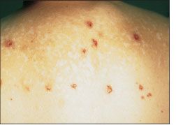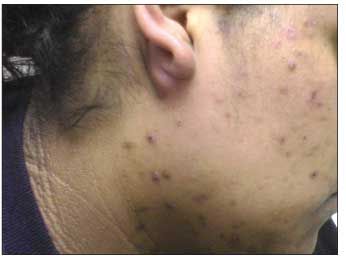 Figure 5 –Papules and scarring on the upper back are seen in the same patient illustrated in Figure 4. (Image and case supplied by Joe R. Monroe, PA-C, MPAS.)