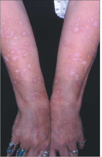 Figure 4 –Characteristic disciform papules and scarring on the arms of this 43-year-old woman are suggestive of neurotic excoriation. Scarring is a telltale sign of chronicity. The shape and size of the lesions are clues to whether they are inflicted with fingernails or sharp objects. (Image and case supplied by Joe R. Monroe, PA-C, MPAS.)