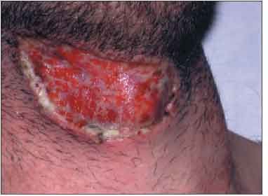 Figure 3 –A patient who believed that worms had burrowed into his neck tried to excise them with a pair of household scissors, resulting in this wound. A toxicology screening was positive for cocaine, opiates, and benzodiazepines. (Image and case supplied by Rocky Benoit, MD, and Jeffrey Suchard, MD.)