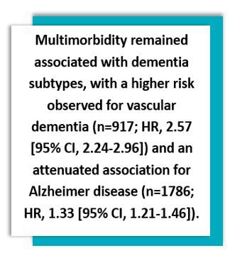 Multimorbidity was associated with a 63% increased risk for dementia among adults older than age 60 years followed for up to 15 years.