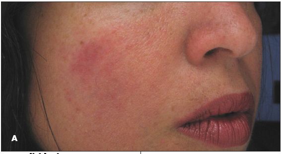 For several months, a 43-yearold woman had erythematous plaques on the cheeks that were more prominent on the right side. The patient had no pruritus but reported occasional facial burning. She had tried overthe- counter lotions but no medicated or corticosteroid topical preparations. She was otherwise healthy and was currently taking no medications.