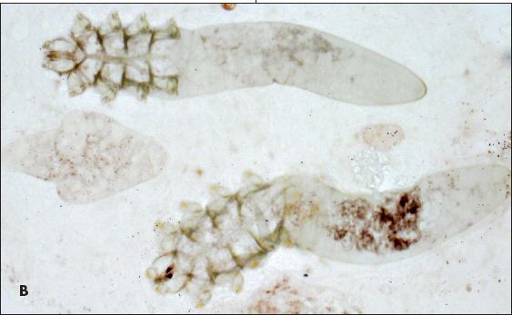 The rash had overlying scale and minimal papules (A). No pustules were noted. Skin scrapings stained with chlorazol black E revealed transparent mites, 0.3 to 0.4 mm in length, with 8 segmented legs (B). Some areas of colonization had as many as 13 mites per visual field. Demodicidosis was diagnosed on the basis of the clinical presentation and microscopic evaluation.