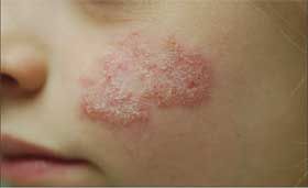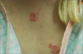 The mother of this 6-year-old girl brings her to your office for evaluation of an itchy rash that started on her left cheek at the end of December. Another physician prescribed cephalexin for presumed impetigo; the rash abated but did not completely clear. During the past 2 to 3 weeks, new lesions have appeared on the child's neck, arms, and trunk.
