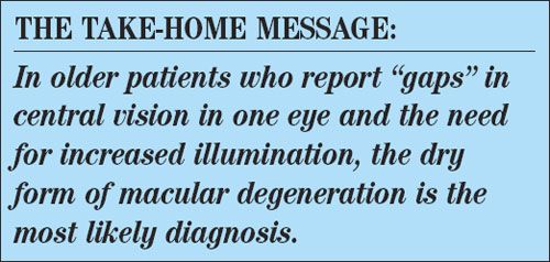 Dry versus wet macular degeneration. There are 2 clinical variants of age-related macular degeneration. The wet form is the more rapidly progressive of the 2 and causes visual distortions, such as straight lines appearing wavy (metamorphopsia). Wet macular degeneration develops in the second eye in 15% of affected patients per year; if left untreated, it can cause legal blindness within months.3 Dry macular degeneration, on the other hand, takes years to complete its progression, and its typical presenting symptoms are gaps in image and increasing need for illumination.