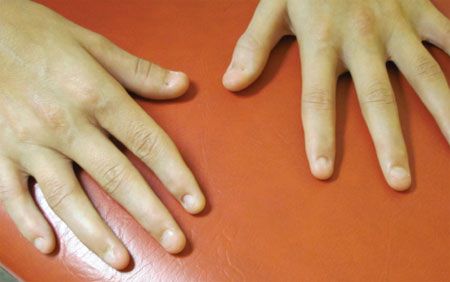 These are the hands of a 16-year-old boy who had surgical correction for clubfeet as an infant. For the previous month, he had had intermittent bilateral foot and ankle pain and some knee and hip discomfort. Examination revealed dysplastic fingernails and toenails and bilateral absent patellas, with no edema or arthritis. These are the characteristic features of nail-patella syndrome, or hereditary onycho-osteodysplasia.