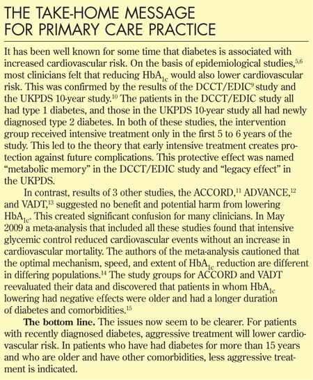 Apparent drawbacks of intensive therapy. In 2008, when the results of the 10-year follow-up of patients in the UKPDS were released, 2 studies that contradicted the protective effect of lowering HbA1c, the Action to Control Cardiovascular Risk in Diabetes (ACCORD) study11 and the Action in Diabetes and Vascular Disease: Preterax and Diamicron Modified Release Controlled Evaluation (ADVANCE) trial,12 were published. The results of the ACCORD study seemed to indicate that reducing HbA1c to lower or near-normal levels increased mortality. The study was stopped prematurely because of this finding. The ADVANCE investigators concluded that lower to near-normal blood glucose levels did not reduce cardiovascular events.
