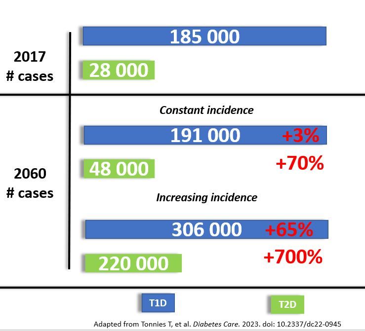 Reference: Tönnies T, Brinks R, Isom S, et al. Projections of type 1 and type 2 diabetes in the US population aged <20 years through 2060: the SEARCH for Diabetes in Youth study. Diabetes Care. Published online December 29, 2022. doi: 10.2337/dc22-0945