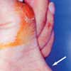 Figure 1 – Hypertension of the metatarsal phalangeal joint (MTPJ) is seen in this clawed right hallux. Note the superficial ulcer (secondary to irritation from shoe contact) over the hyperflexed interphalangeal joint. The extensor tendon "bowstrings" (arrow) over the MTPJ because of joint hyperextension. An in-office percutaneous tenotomy with a 2- to 3-mm incision can eliminate the extensor force that is causing the deformity.
