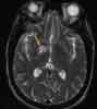 One week later, a second MRIscan shows a similar pattern of rightsidedlesions (Figure 3). No newlesions are detected. An area of increasedsignal intensity in the rightbasal ganglia is compatible with adiagnosis of septic embolism orinfarction.