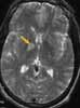 An MRI scan of the brain is ordered to determinethe cause of the patient's continued left-sided weakness(Figure 1). The scan shows multiple small lesions of uncertainorigin within the right parietal lobe, basal ganglia,and temporal lobe. The scan also reveals a focal area ofcerebritis or a small parenchymal contusion with minimalincreased signal within the right basal ganglia on the T1-weighted image, which suggests petechial hemorrhage.