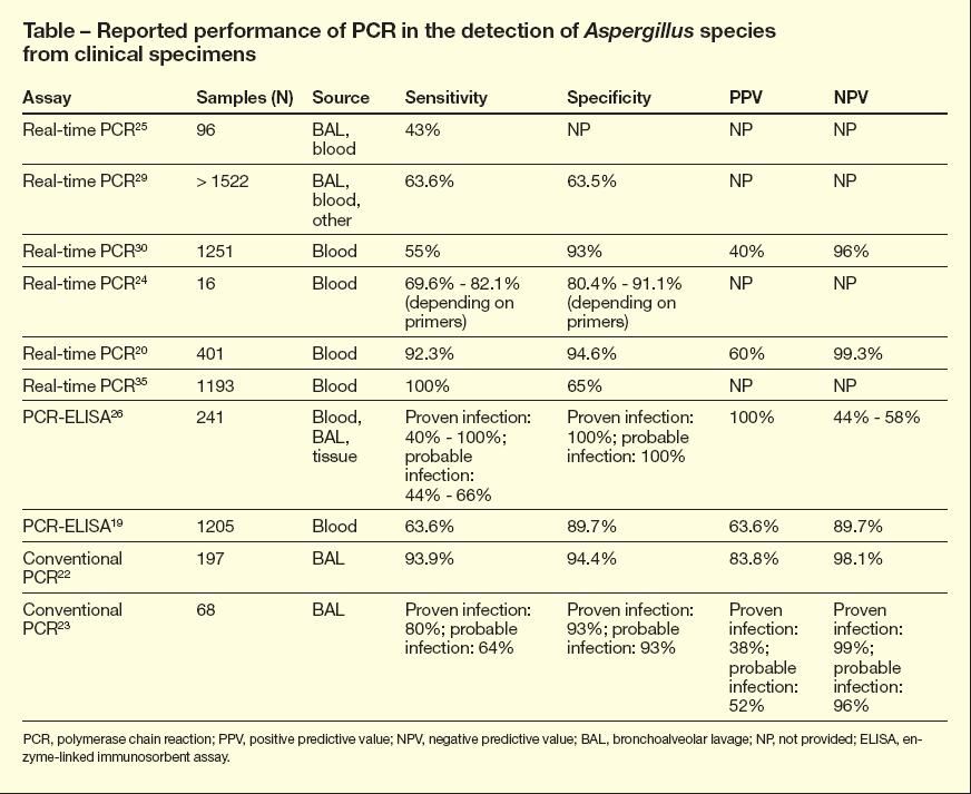 The value of PCR in the diagnosis of invasive aspergillosis has been evaluated in several studies (Table). The sensitivity, specificity, negative predictive value, and positive predictive value vary widely between studies depending on the pretest probability of infection and type of PCR used (eg, real-time vs nested).22-25 The low positive predictive value of PCR assays when bronchoalveolar lavage specimens are used (range, 38% to 83.5%) likely reflects the difficulty in distinguishing airway colonization from infection.22-25