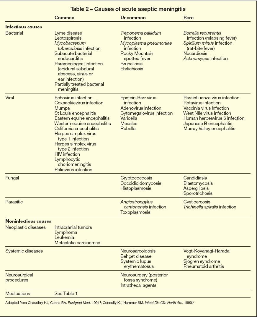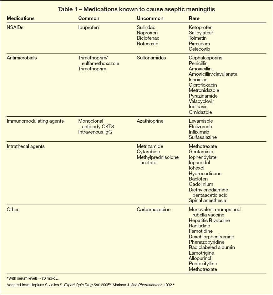 A septic meningitis refers to a nonbacterial inflammation of the leptomeninges.1 Viruses are the most common cause of aseptic meningitis, and the most common viruses that cause aseptic meningitis are enteroviruses. Drug-induced aseptic meningitis is rare but probably more common than the literature would suggest; therefore, it should be included in the differential diagnosis of aseptic meningitis, particularly if aseptic meningitis develops in association with the use of NSAIDs or other offending drugs (Table 1) and if clinical recovery is rapid following cessation of the drug or if results of viral studies are negative.