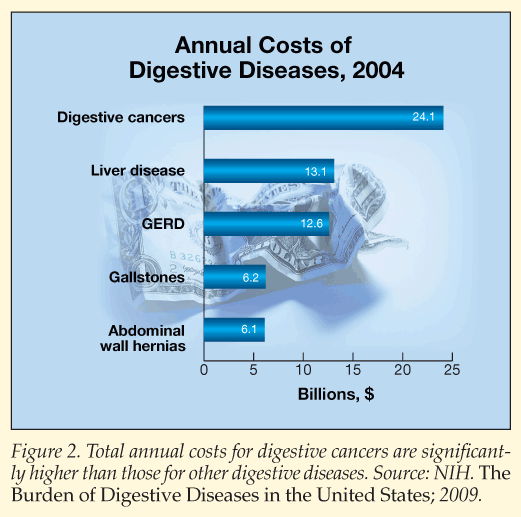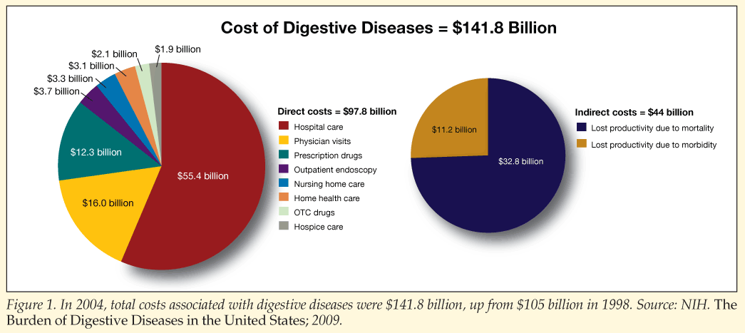 Digestive diseases are costly to manage, with annual costs totaling $141.8 billion in 2004 (Figure 1), according to an NIH report. Direct costs associated with digestive diseases jumped from $85 billion in 1998 to nearly $98 billion in 2004. Prescription drug costs alone were $12.3 billion. Indirect costs for digestive diseases more than doubled, from $20 billion in 1998 to $44 billion in 2004, of which $32.8 billion was associated with lost productivity caused by increased mortality.
