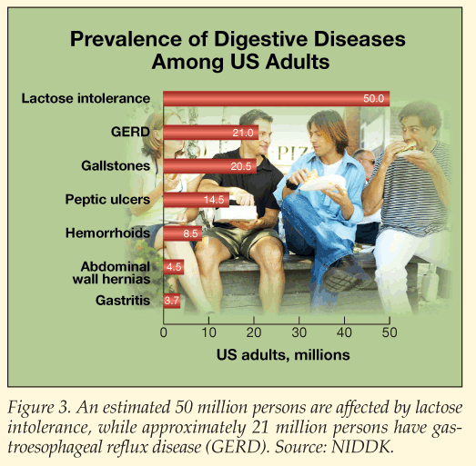 Approximately 70 million US adults are affected by digestive diseases. The National Institute of Diabetes and Digestive and Kidney Diseases (NIDDK) estimates that 50 million persons are lactose intolerant (Figure 3).