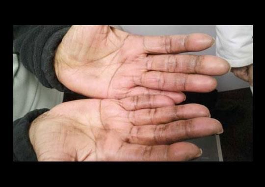 The 60-year-old black woman has a history of joint pain, muscle weakness, and Raynaud phenomenon. Why the “dirty hands”?
