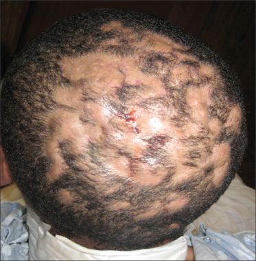 For the past 7 years, a 32-year-old African American man had multiple nonpruritic scalp abscesses. He also reported intermittent fever and joint pain. The abscesses had been drained on many occasions, and he had received several antibiotics, although no organisms had been isolated. Collagen vascular disease, SAPHO syndrome (synovitis, acne, pustulosis, hyperostosis, osteitis), discoid lupus, and cutaneous sarcoid had been ruled out. During the past 7 years, he had been treated with prednisone, methotrexate, and hydroxychloroquine, without any response.