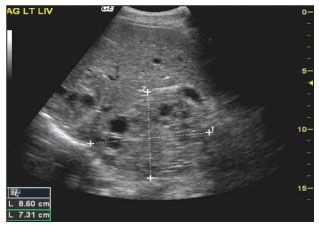 Figure 2 – An ultrasonogram of the liver shows a large echinococcal cyst in the left lobe.