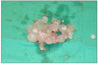 Figure 6 –These multiple daughter cysts were evacuated from the large echinococcal cyst in the left lobe of the liver.