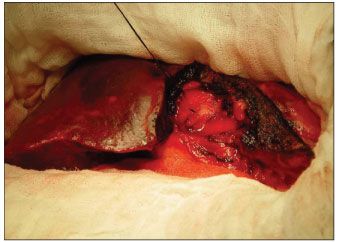 Figure 4 – A purse-string suture is placed in the wall of the large echinococcal cyst in the left lobe of the liver to control potential spillage of cyst contents.