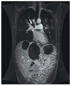Figure 3 – A magnetic resonance angiogram of the chest demonstrates filling defect (arrow) in the right pulmonary artery extending to the apical branch of the right upper lobe pulmonary artery consistent with the presence of multiple echinococcal cysts. Multiple liver cysts are also seen.