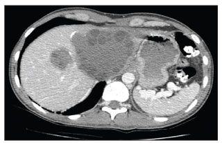 In 2005, he experienced fatigue and abdominal pain and multiple cysts were found in the liver. Surgical resection was recommended, but the patient was reluctant to undergo surgery again and did not keep his follow-up appointments. Two years later, he presented to our institution.