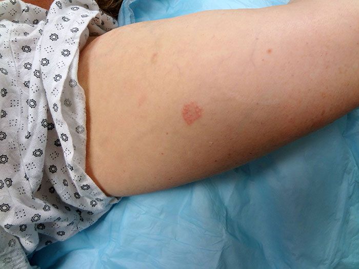Round plaques like this one, each composed of many small erythematous papules, are classic for granuloma annulare. Large numbers of these lesions and widespread distribution is often associated with diabetes mellitus.