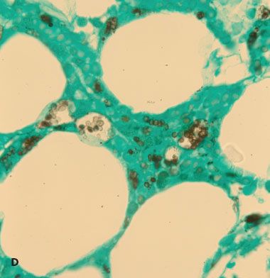 After the platelet count dropped to 20,000/μL and neutropenia developed (absolute neutrophil count, 879/μL), a bone marrow biopsy was performed. Results showed histiocytes containing yeast cells on Wright-Giemsa (A and B), periodic acid-Schiff (C), and Grocott-Gomori methenamine silver (D) staining methods. These findings were consistent with histoplasma and were confirmed with bone marrow culture growth of Histoplasma capsulatum.