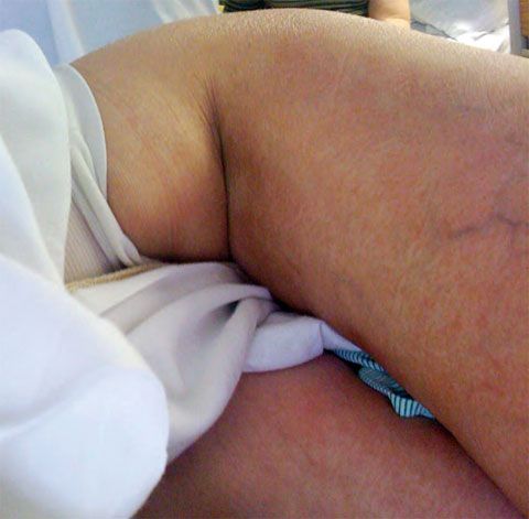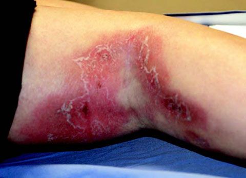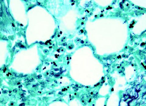 For 3 days, a 28-year-old woman with a history of polymyositis and possible dermatomyositis had fever, chills, and nonproductive cough. She complained of rash, joint pain, and progressive immobility because of severe muscle weakness. For the past 6 years, she had been taking prednisone (60 mg/d), hydroxychloroquine (200 mg bid), and tramadol (100 mg q6h prn for pain).
