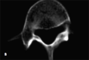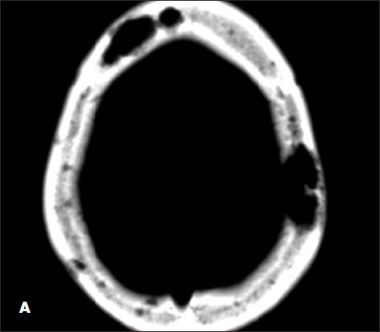 The patient had mild leukocytosis, anemia, and corrected calcium level of 11 mg/dL. Cerebrospinal fluid analysis yielded normal results. A brain CT scan showed multiple lytic lesions in the calvarium, with the largest in the left parietal bone (A). Abdominal CT revealed hepatosplenomegaly with low-attenuation lesions and scattered lucencies throughout the vertebral bodies (B).