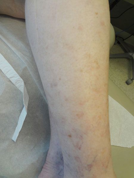 Key point: Close examination disclosed that the lesions were round to oval dyschromic macules, each of which was surrounded by a fine but clearly palpable scale-like border. This is pathognomonic for disseminated superficial actinic porokeratosis (DSAP). This disorder is seen primarily on upper and lower extremities in individuals who have had considerable sunlight exposure throughout their lives. The palpable border has a typical histologic appearance, which is useful to confirm the diagnosis.