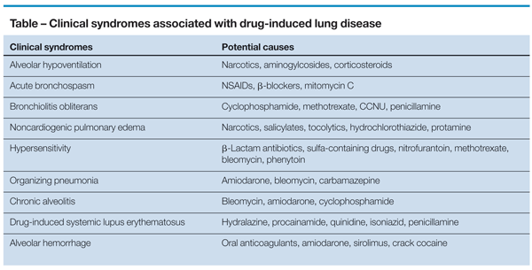 p>Drug-induced lung disease (DILD) can be caused by a variety of agents, including chemotherapeutic drugs, antiarrhythmic agents, antibiotics, and NSAIDs. The clinical syndromes associated with DILD include alveolar hypoventilation, acute bronchospasm, organizing pneumonia, and hypersensitivity reactions. Amiodarone lung toxicity often manifests as a chronic fibrosing alveolitis, characterized by an insidious onset of cough, dyspnea, and weight loss. Important components of the workup include chest radiography, pulmonary function testing, and bronchoscopy with bronchoalveolar lavage (BAL). BAL is particularly helpful in identifying eosinophilic pneumonia and diffuse alveolar hemorrhage and in ruling out infectious causes. Management includes drug withdrawal and, in some cases, corticosteroid therapy. Before starting corticosteroids, it is important to rule out infectious causes of lung disease, particularly in patients receiving chemotherapy. (J Respir Dis. 2009;30(1))