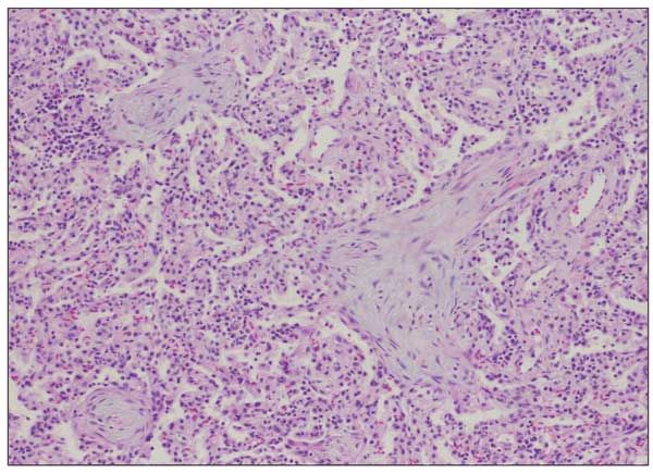 Patients with organizing pneumonia may present with a flu-like illness with fever, cough, weight loss, and progressive dyspnea. Chest radiographs demonstrate patchy areas of consolidation, ground-glass and nodular opacities, and bronchial wall thickening and dilation (Figure 4).16 Lung biopsy demonstrates preserved lung architecture with distinct intraluminal buds of granulation tissue (Figure 5).