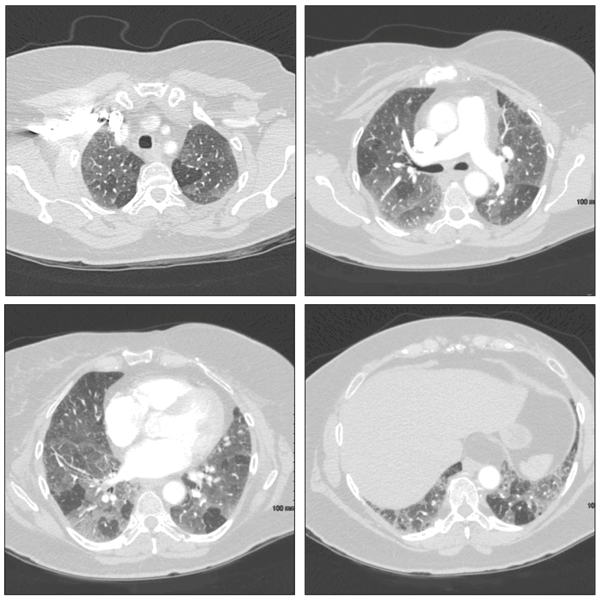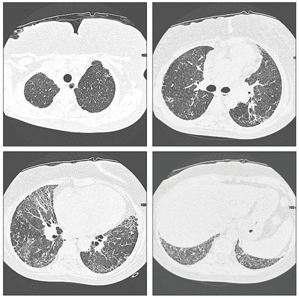 Figure 1 – These CT scans are from a patient with a subacute hypersensitivity reaction to nitrofurantoin. Findings include bilateral patchy areas of ground-glass opacity and areas of air trapping.