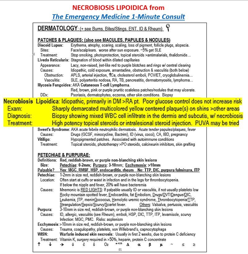 Necrobiosis lipoidica is an idiopathic skin condition that most commonly affects patients with diabetes, but also sometimes those with rheumatoid arthritis. Skin lesions are well-demarcated plaques that are typically on the lower extremities, especially the shins. They are usually asymmetric and typically have a yellowish center.