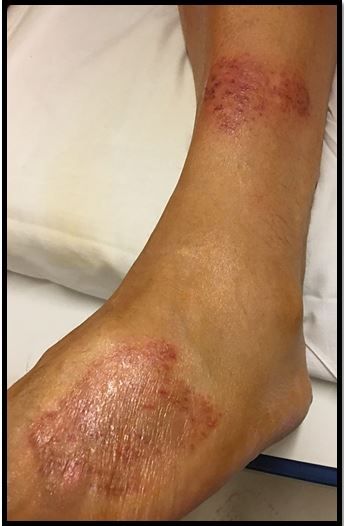 Vital signs were normal. Physical exam was normal except for one lesion on the right ankle and four of them on the left foot, shin and calf. Two of the lesions are shown in the image below.