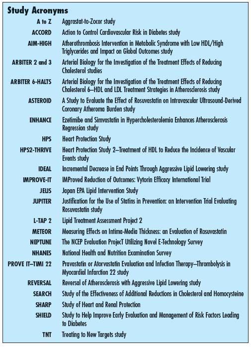 In 2004, the ATP III guidelines were updated with evidence from several new controlled clinical studies of statins that evaluated cardiovascular outcomes. The LDL-C goal of < 100 mg/dL was maintained as a firm recommendation for patients at high risk for cardiovascular events; however, a goal of LDL-C < 70 mg/dL was recommended as an option for patients at very high risk.10 The rationale for this optional LDL-C goal of < 70 mg/dL was based on the results of the Heart Protection Society (HPS) and PROVE IT–TIMI 22 studies. A subgroup analysis of HPS showed that simvastatin compared with placebo significantly reduced the risk of a first major vascular event in participants with LDL-C < 116 mg/dL at baseline.11 Most importantly, PROVE IT–TIMI 22 (Table 1), which compared the effects of moderate and intensive statin therapy on a composite end point of cardiovascular events and all-cause death in patients with acute coronary syndrome (ACS), demonstrated that a median LDL-C level of 62 mg/dL in the intensive therapy group, compared with 95 mg/dL in the moderate therapy group, was associated with a statistically significant 16% relative risk reduction.12