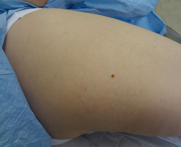 A 27-year-old woman noted a gradually increasing, asymptomatic dark spot on the right lateral thigh. The remainder of the cutaneous exam was normal. The patient's mother and sister had both had melanoma.