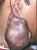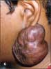These extensive, smooth, irregular masses of pigmented tissue on the earlobes of a 28-year-old woman are keloids. The patient had her ears pierced at age 6 years; the masses began to develop when she was about 9 to 10 years old. The right earlobe mass arose first and is larger. She had one other keloid of 1 cm on her chest that had developed after a scratch. She denied any other skin lacerations or incisions.